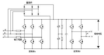 電機(jī)產(chǎn)生的能量通過逆變側(cè)的二極管回饋到母線電壓,當(dāng)直流母線電壓超過一定的值,整流側(cè)能量回饋控制部分啟動(dòng),將直流逆變成交流,通過控制逆變電壓相位和幅值將能量回饋到電網(wǎng)。